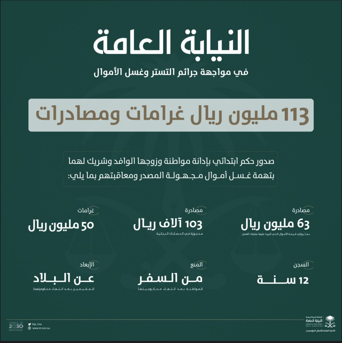المصدر أكد على انتهاء التحقيقات وإحالة المتهمين للمحكمة المختصة، وصدر بحقهم حكم ابتدائي يتضمن إدانتهم بما نسب إليهم، ومصادرة قيمة مماثلة الأموال المحولة للخارج والبالغة (٦٣.٠٤٥.٥٥٠) ثلاثة وستين مليوناً وخمسة وأربعين ألفا وخمسمائة وخمسين ريالاً، ومصادرة الأموال المحجوزة في حسابات المتهمين والكيان التجاري البالغة (١٠٣.٣٢٢.٢٣) مئة وثلاثة آلاف وثلاثمئة واثنين وعشرين ريالاً وثلاث وعشرين هللة، وغرامات مالية بلغت (٥٠.٠٠٠.٠٠٠) خمسين مليون ريال، وسجنهم لمدد بلغت اثنا عشر سنة، ومنع المواطنة من السفر مدة مماثلة لمدة سجنها، وإبعاد المتهمين الوافدين بعد انتهاء محكومياتهم، ومنع الكيان التجاري بصفة دائمة من نشاطه التجاري.
