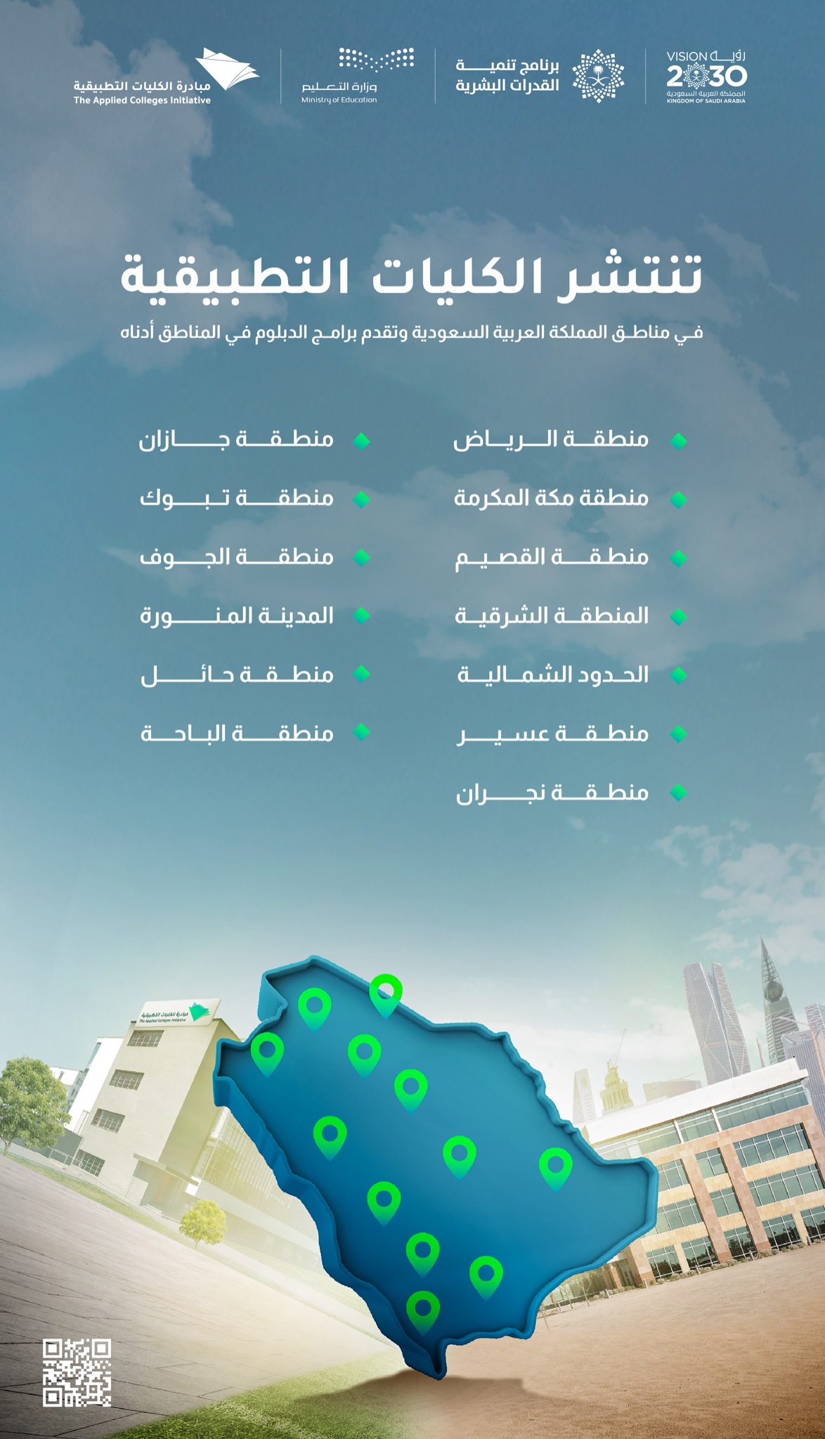 تنتشر #الكليات_التطبيقية في كافة مناطق المملكة؛ لتعزيز كفاءة رأس المال البشري بما يتواءم مع متطلبات سوق العمل، ويُحقق #رؤية_السعودية_2030.
