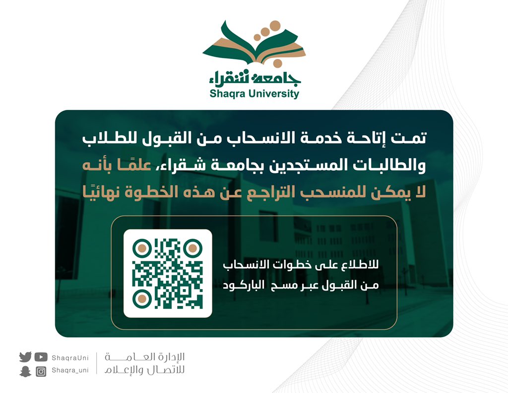 جامعة شقراء تتيح خدمة الانسحاب من القبول للطلاب والطالبات المستجدين بـ #جامعة_شقراء، علمًا بأنه لا يمكن للمنسحب التراجع عن هذه الخطوة نهائيًا.