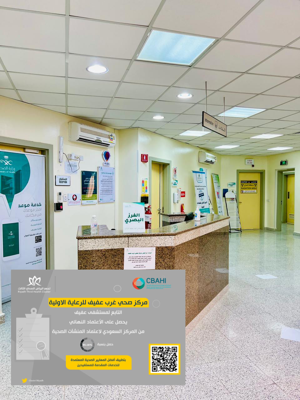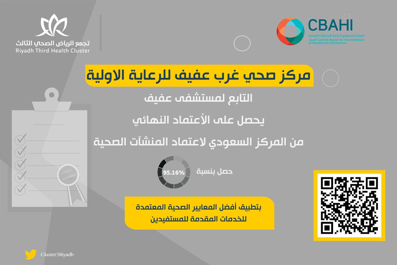 حصل مركز الرعاية الصحية الأولية غرب عفيف التابع لقطاع الصحة العامة بمستشفى عفيف العام على شهادة اعتماد المركز السعودي لاعتماد المنشآت الصحية (سباهي)، وذلك بعد اجتيازه معايير التقييم الشامل للمركز، وتطبيق معايير الجودة ومكافحة العدوى وسلامة المرضى في الرعاية الصحية الأولية.