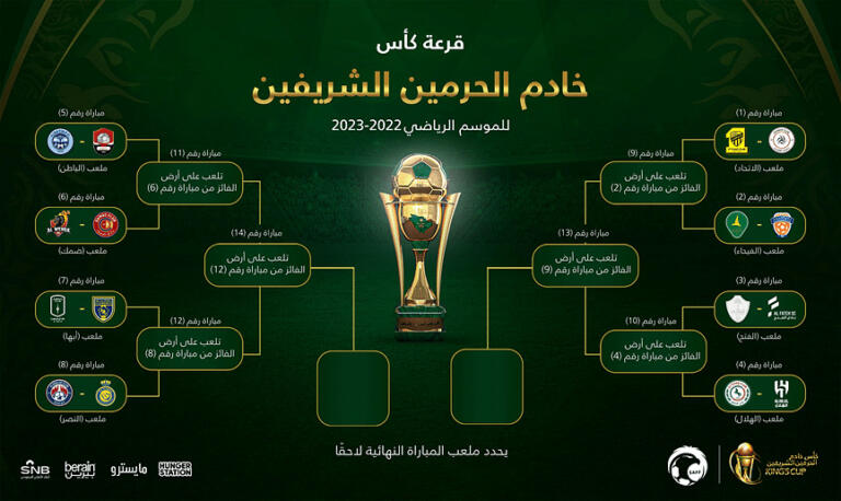 ووفقاً لنظام القرعة التي جرت من دون تصنيف الأندية، فإن المواجهات الكبيرة بخلاف لقاء الاتحاد والشباب، ستكون مؤجلة حتى الدور نصف النهائي على الأقل، حيث وضعت القرعة الثلاثي الاتحاد والشباب والهلال في المسار الأول إلى جانب فرق الفيحاء، الخليج، الفتح، الطائي، والاتفاق.