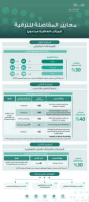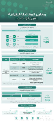 وتأتي معايير المفاضلة للترقية (للمرتبة العاشرة فما دون) متضمّنة معيار تقويم الأداء الوظيفي بإجمالي وزن المعيار قدره 30%، ومعيار برامج التطوير والتدريب بإجمالي وزن المعيار 40%، ومعيار المبادرات والإنجازات (العمل التطوعي) بإجمالي وزن المعيار 30%، فيما تضمنت معايير المفاضلة للترقيات في المراتب (11، 12، 13) معيار تقويم الأداء الوظيفي بإجمالي وزن المعيار 30%، ومعيار برامج التطوير والتدريب بإجمالي وزن المعيار 40%، إضافة إلى معيار اختبارات الكفايات القيادية لدى قياس بإجمالي وزن المعيار 30%.