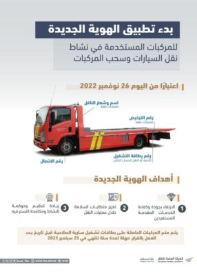 أعلنت الهيئة العامة للنقل بدء تطبيق الهوية الجديدة للمركبات المستخدمة في نشاط نقل السيارات وسحب المركبات، اعتباراً من اليوم 26 نوفمبر 2022.