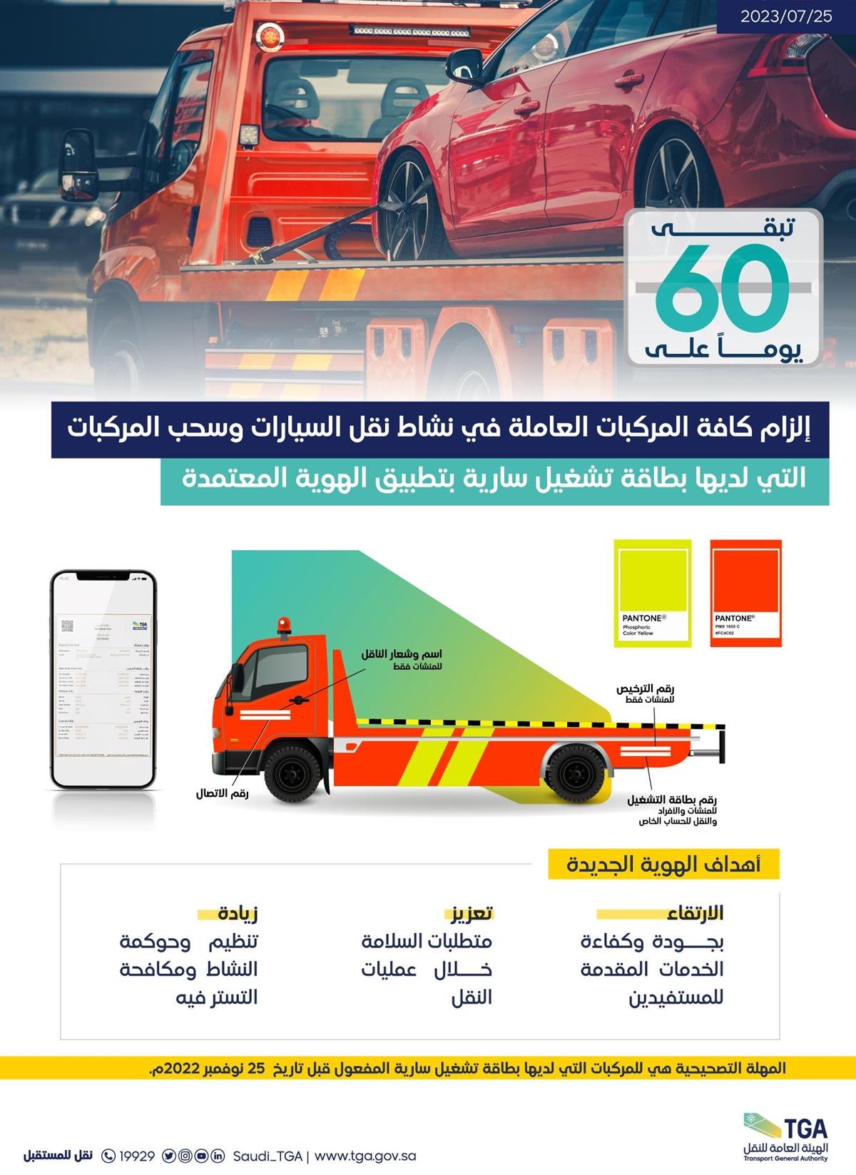 أكدت الهيئة العامة للنقل أن الفترة المتبقية للمهلة التصحيحية لبدء تطبيق الهوية الجديدة للمركبات المستخدمة في نشاط نقل السيارات وسحب المركبات، ستنتهي بعد 60 يومًا، حيث تهدف الهيئة من خلالها إلى تطوير الخدمات المقدمة للمستفيدين، وتعزيز متطلبات السلامة خلال عمليات النقل، كما ستمكن الهوية الجديدة من زيادة تنظيم وحوكمة النشاط ومكافحة التستر فيه، وبما يضمن الارتقاء بجودة وكفاءة هذه الخدمات.
