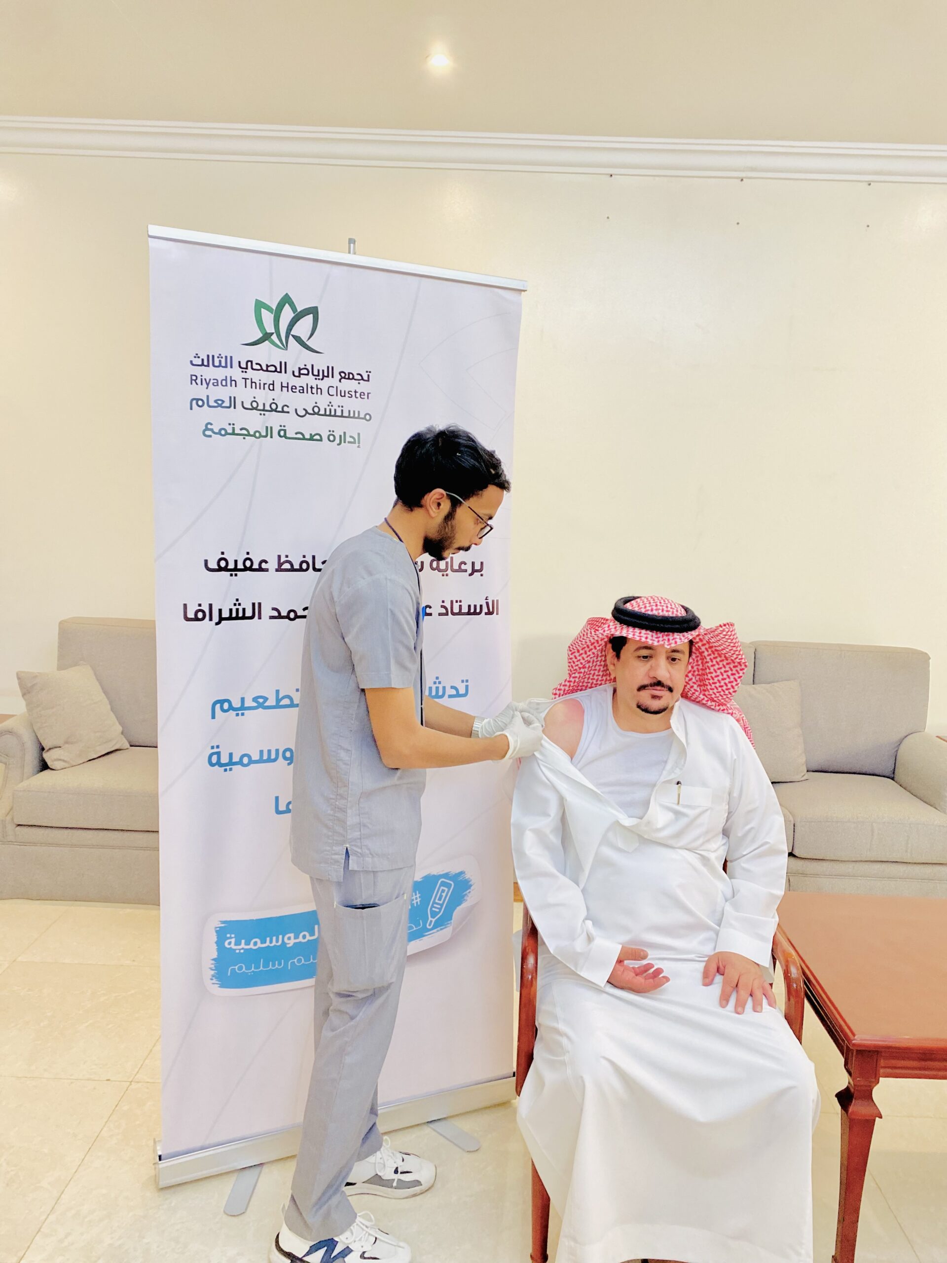دشن محافظ عفيف الأستاذ عبدالله بن محمد الشرافا صباح اليوم الحملة الوطنية للتطعيم ضد الأنفلونزا الموسمية بحضور مدير مستشفى عفيف العام فهم بن ماضي المغيري وذلك بمقر ديوان المحافظة.