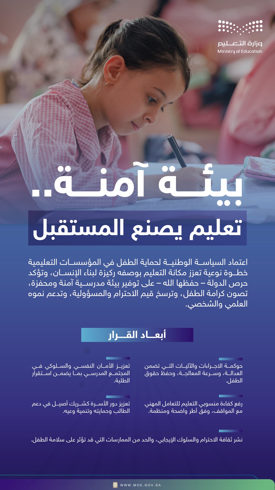 صدرت موافقة #مجلس_الوزراء على “السياسة الوطنية لحماية الطفل في المؤسسات التعليمية”، والتي تعد خطوة مفصلية تعزز استثمار الدولة في الطفل، وصون حقوقه ورعايته، بوصفه الثروة الأهم، والركيزة الأساس للتنمية المستدامة.